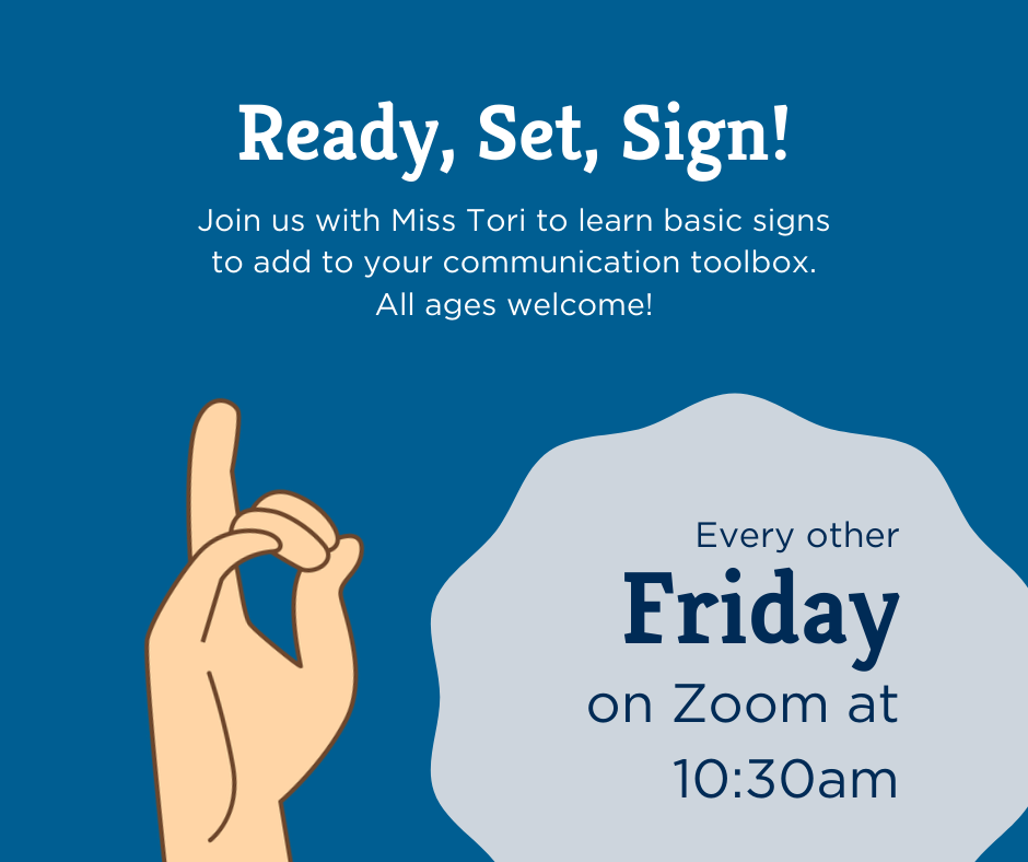 Join us every other Friday at 10:30am on Zoom as Miss Tori teaches us basic sign language. All ages welcome! (Class is only on Friday, February 24th this month)
